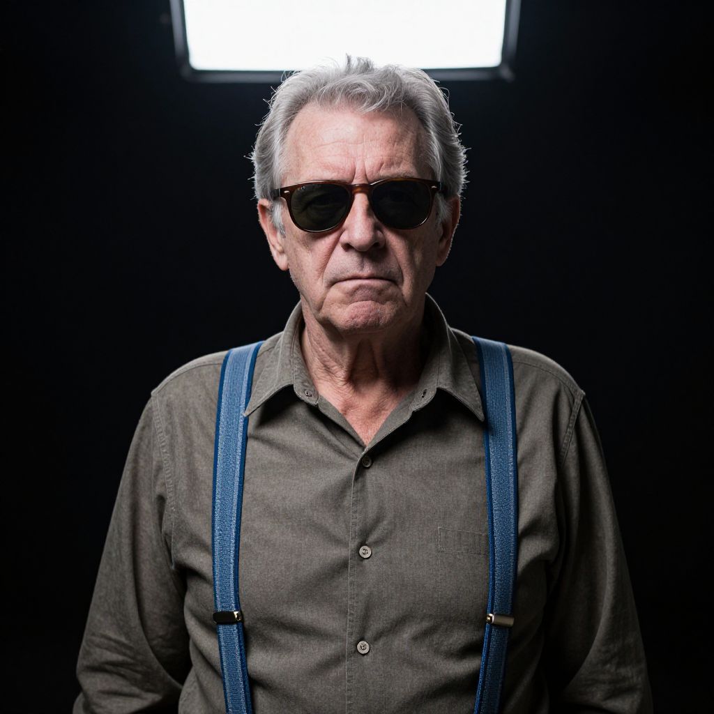 Photograph of an older white man with gray, slightly wavy hair, wearing black sunglasses, a black button-up shirt, and blue suspenders. His expression is serious and slightly stern. The background is completely black, with a bright white square light source above his head, creating a stark contrast. The texture of the shirt is slightly wrinkled, and the suspenders add a casual yet stylish touch. The lighting highlights the contours of his face and upper body, emphasizing his aged skin texture and defined facial features. The overall composition is dramatic and focused.