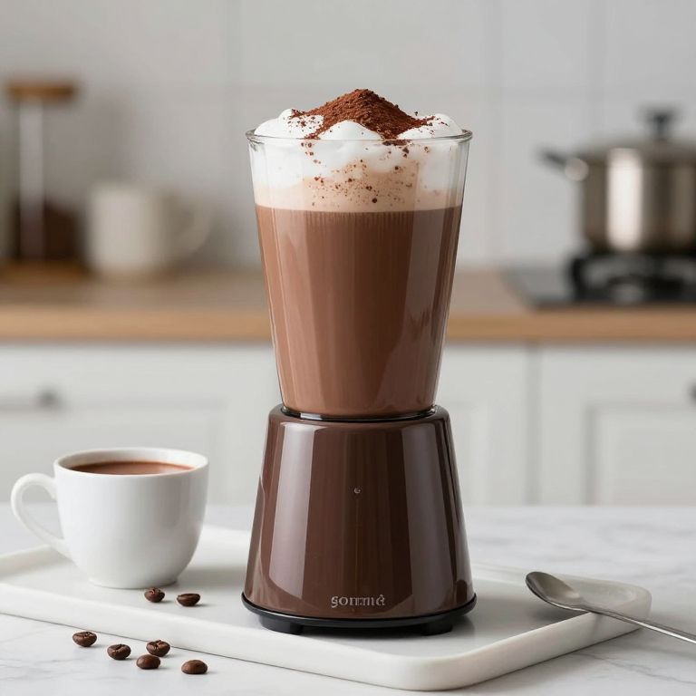 Gourmet Hot Chocolate Maker showcasing a tall glass container filled with rich, dark chocolate beverage topped with frothy milk and cocoa powder, accompanied by a small white cup of hot chocolate and scattered coffee beans on a white tray, set against a clean, modern kitchen backdrop.