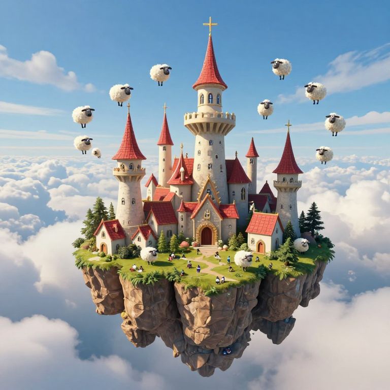Digital artwork of a floating medieval island church with multiple spires, surrounded by lush greenery, connected by a wooden bridge, over a calm blue sea
