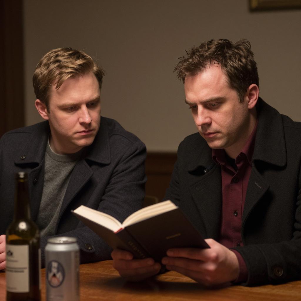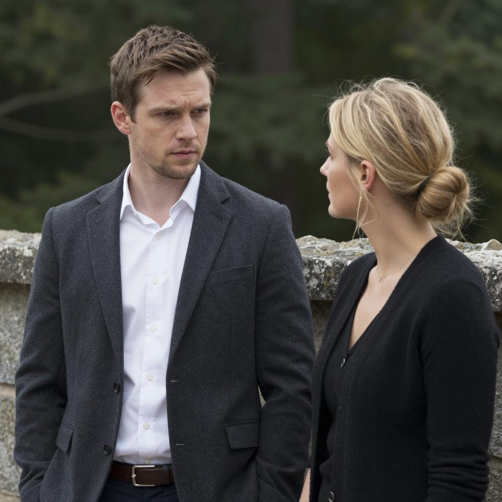 Two people sitting on a white pipe in a green, grassy area. Man with brown shirt, blue jeans, and short brown hair sits with hands clasped, looking to the right. Woman with short brown hair, maroon dress, and hands clasped sits next to him, looking at him. Stone wall in background. Man's expression is serious, woman's expression is soft. Both sit with legs bent.