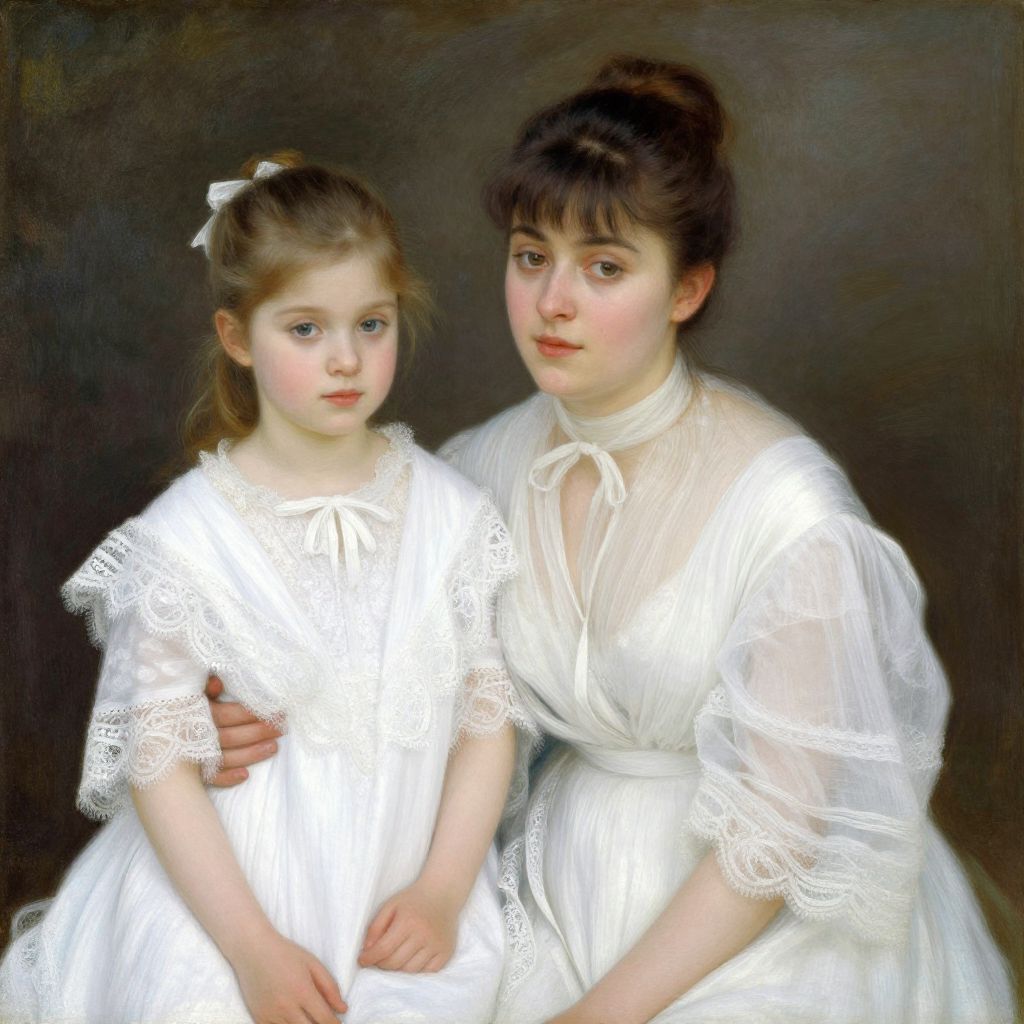 Digital painting of a young girl and an older woman in white, lace-trimmed dresses, seated together against a dark background. The woman gently holds
