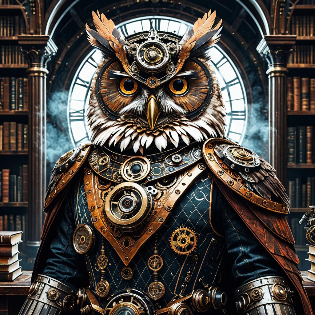 Close-up portrait of a highly detailed steampunk mechanical owl wearing an ornate, gear-adorned outfit with clockwork elements. The owl features large expressive yellow eyes and a top hat integrated with clock components. It is posed inside a futuristic steam-powered library with wooden bookshelves and vintage lighting, showcasing intricate textures and dramatic lighting.