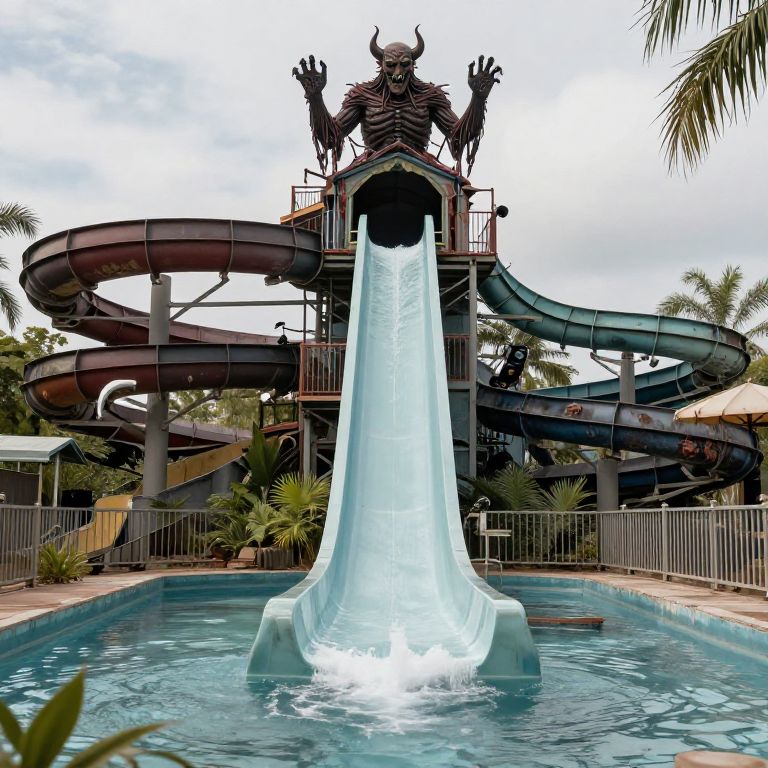 Photograph of a colorful inflatable water slide with yellow sides, red handrails, blue slide, and green palm tree tops, set in a sunny park