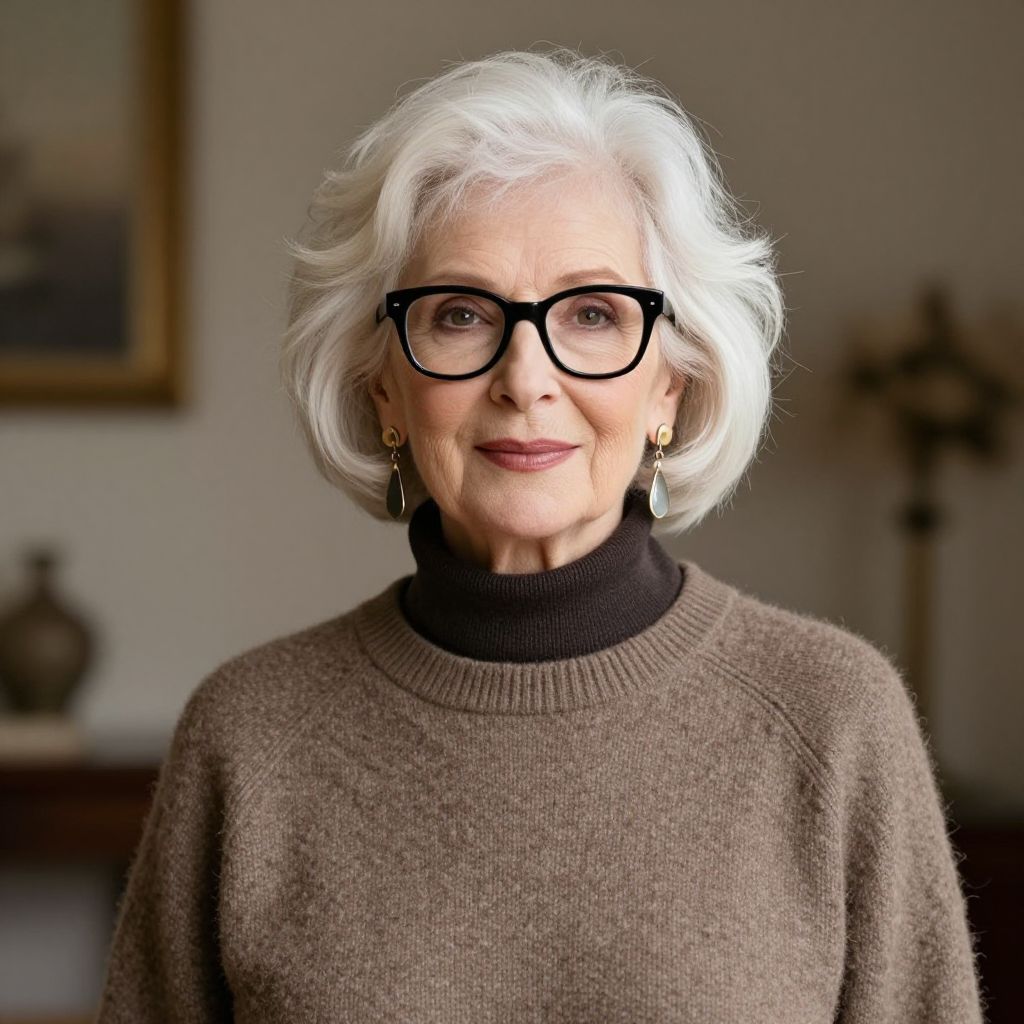 Elderly woman with voluminous white hair styled in a tousled bob, wearing bold black-framed glasses, dangling earrings, and a cozy brown knit sweater over a dark turtleneck, exudes timeless elegance and confidence against a softly lit indoor backdrop.