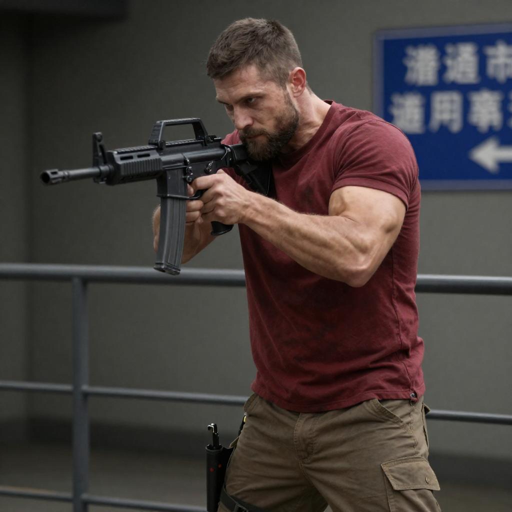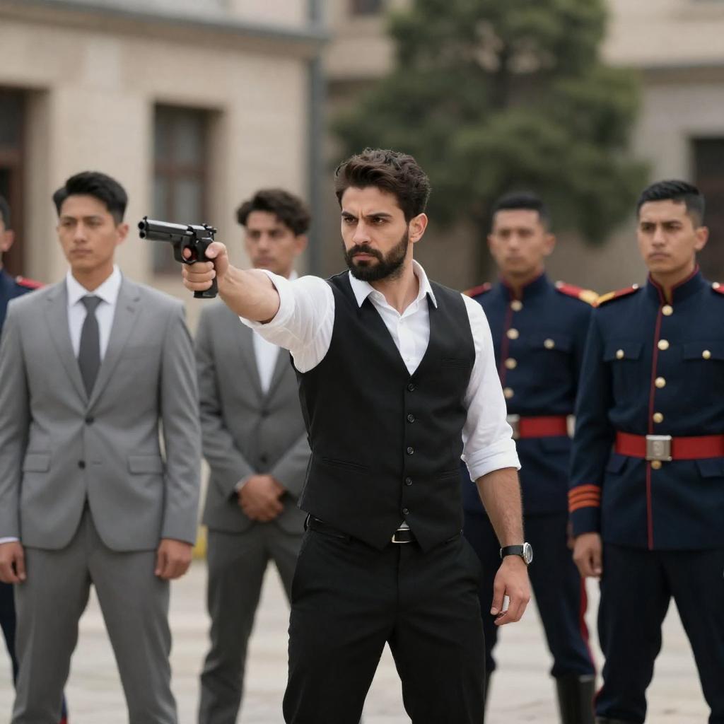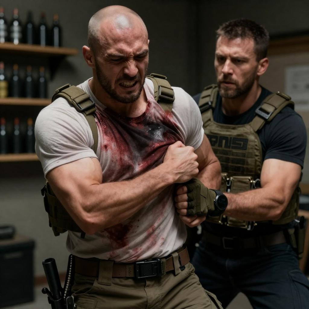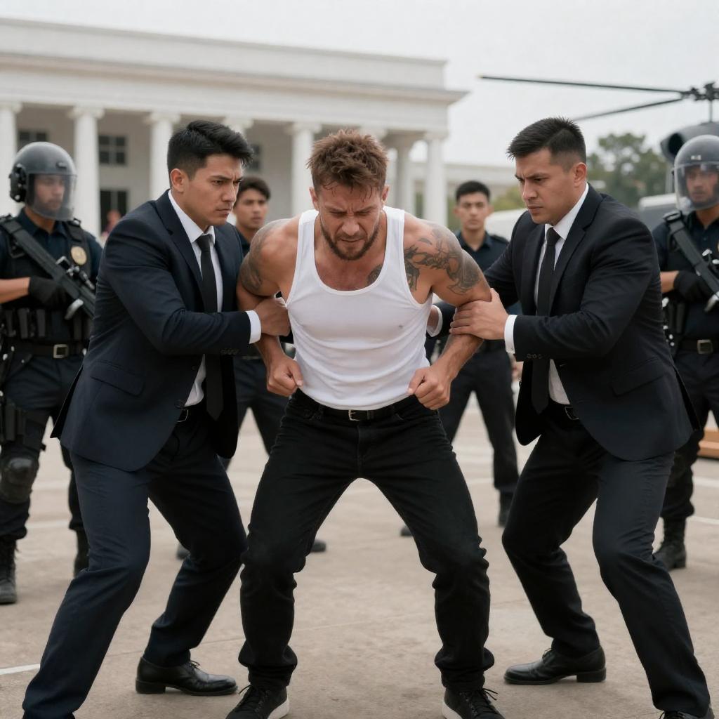Photograph of a chaotic scene. A muscular man in a white tank top, black pants, and tattoos is being pushed by two men in suits. Armed soldiers in riot gear surround them. Background includes a white building with columns and helicopters. The muscular man's face is tense, one suit-wearing man's face is intense, the other suit-wearing man's face is determined. Multiple people, diverse expressions, action-oriented poses.