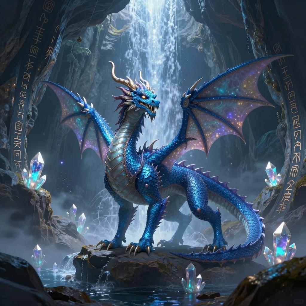 Digital painting of a majestic blue dragon standing on rocky terrain inside a glowing mystical cave. The scene includes luminescent waterfalls, glowing crystals, and ancient runes etched on cave walls. The environment is imbued with magical and serene atmosphere featuring iridescent light effects and intricate textures emphasizing the dragon's scales and the cave's ethereal beauty.