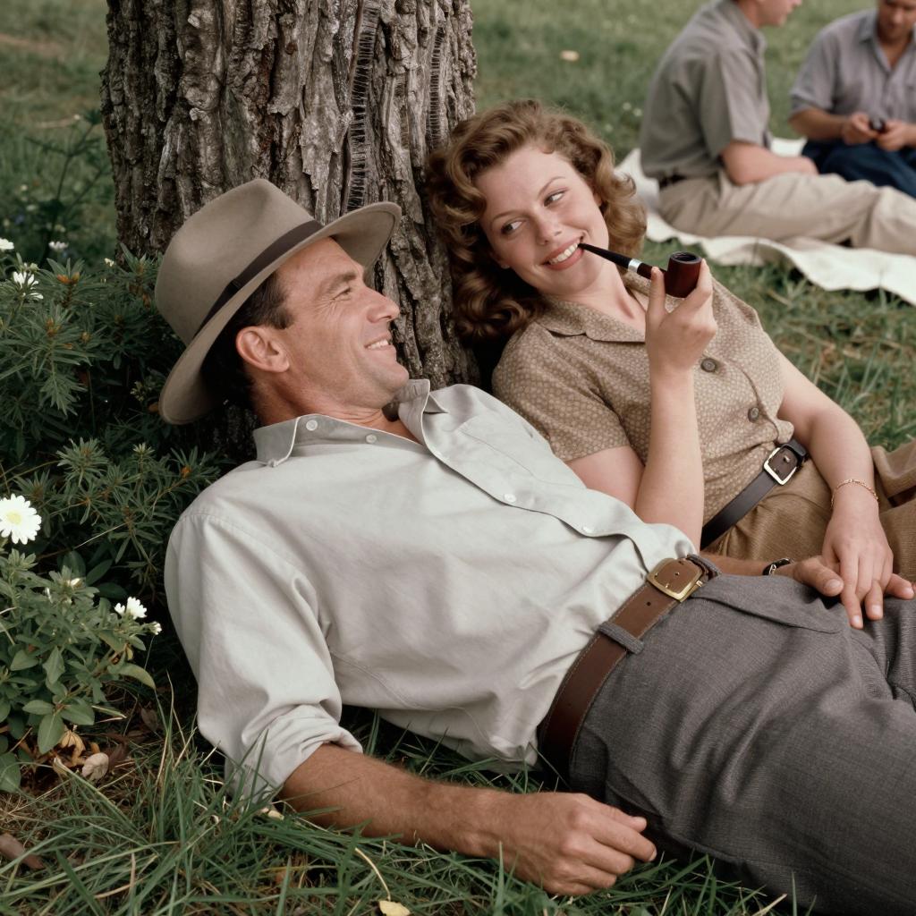 A man and woman dressed in casual 1940s-style clothing lie on the grass, leaning against a large tree. The man wears a wide-brimmed hat and light-colored shirt, smiling at the woman. The woman, with wavy hair, holds a smoking pipe to her mouth while smiling back. Green bushes and white flowers surround them. In the background, two additional people sit on a blanket. The scene depicts a relaxed outdoor moment in a natural setting.