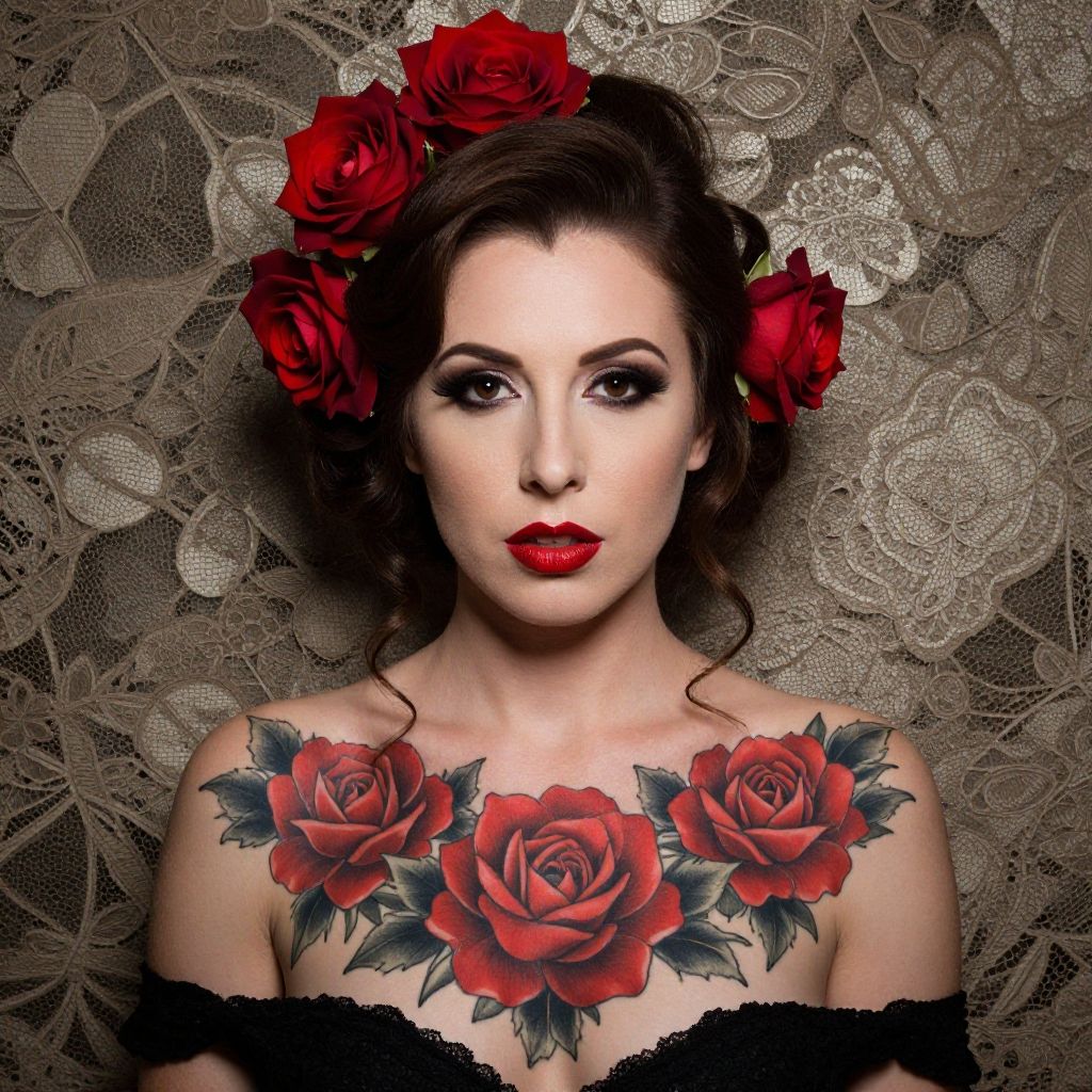A striking portrait of a woman with intricate red and black rose tattoos covering her chest and shoulders, complemented by matching red roses in her styled hair. The detailed, lace-like backdrop and her elegant makeup with bold red lipstick enhance the dramatic and artistic composition.