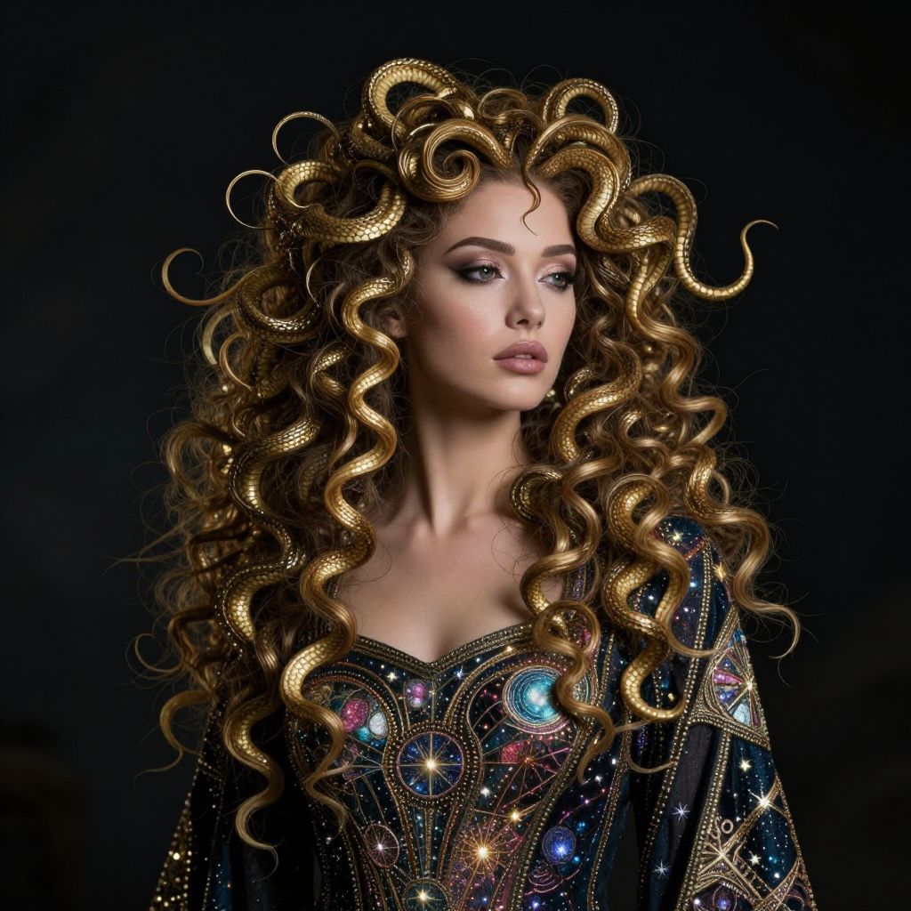 A woman adorned with golden, serpentine curls that twist and coil infinitely, defying gravity and reality, as her attire glimmers with celestial embroidery against a dark, enigmatic backdrop.
