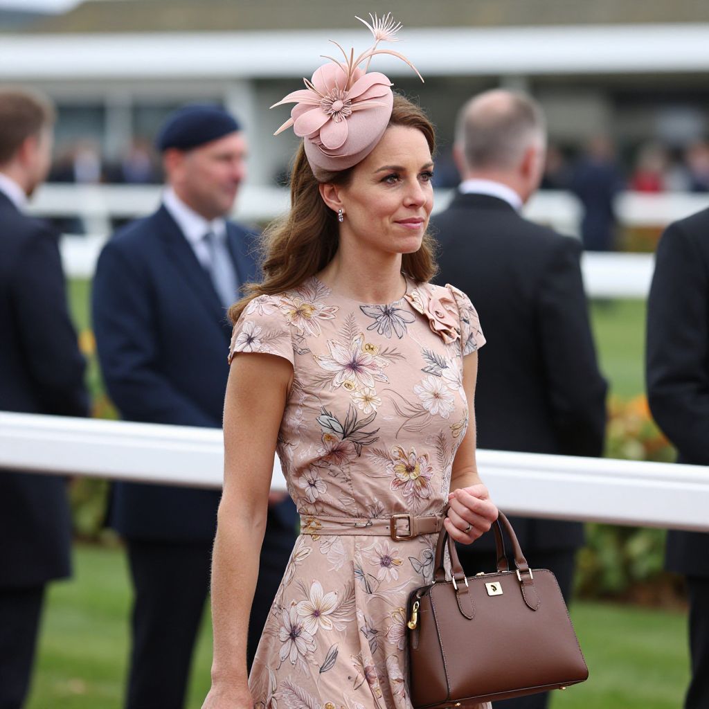 Elegant woman attending York races wearing a blush floral dress, complemented by a matching fascinator adorned with a large pink flower, while carrying a brown leather handbag.