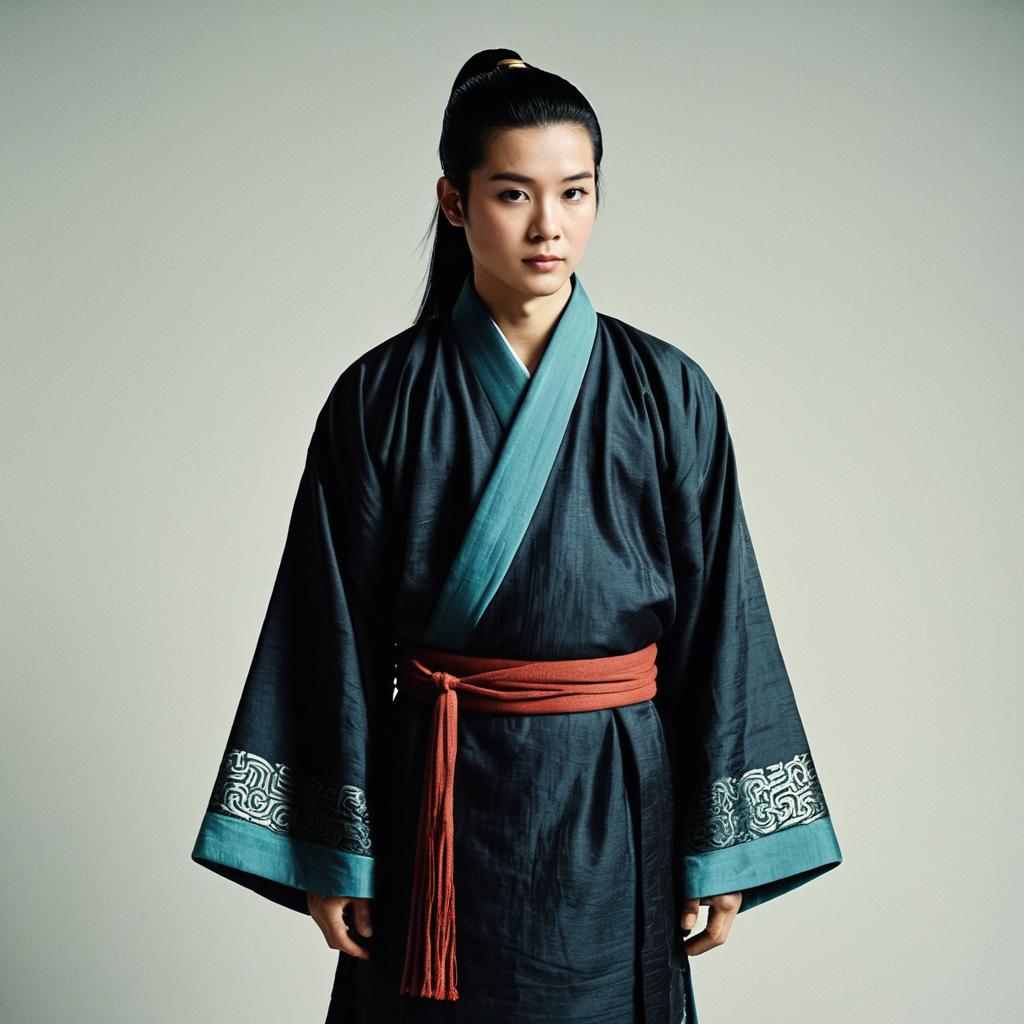 Variant loki costume,solo,jewelry,black hair,outdoors,earrings,blurry background,long hair,blurry,long sleeves,standing,1boy,1girl,chinese clothes,looking at viewer,day,own hands together