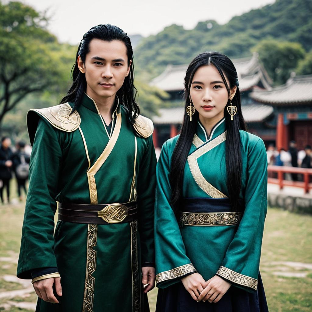 Portrait of a young Asian man and woman wearing traditional Chinese clothing in matching green and gold designs. Both have long black hair and the woman wears decorative gold earrings. They are standing outdoors in front of traditional Chinese architecture with a blurred background, looking directly at the camera.