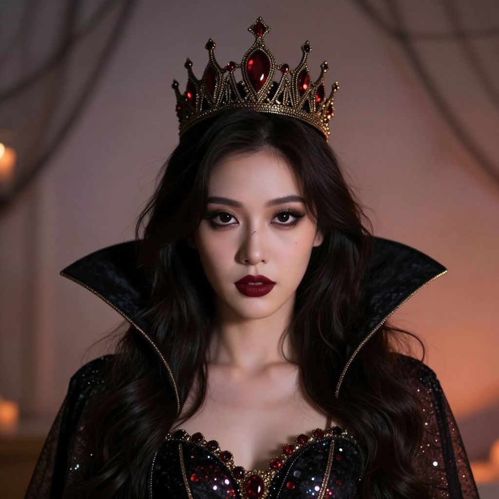 Dark Queen Halloween, a close up of a woman wearing a crown and a dress