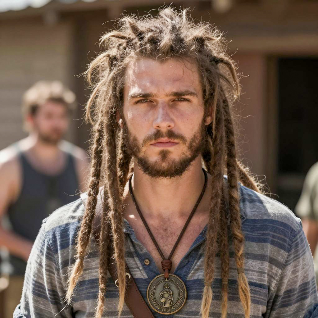 Close-up portrait of a young man with long dreadlock-like brown hair, a beard, and a serious expression. He is wearing a casual striped blue and gray shirt and a large brown leather necklace with a round medallion. The photo is taken outdoors during daytime with natural light, featuring a slightly sunlit setting and a blurred background that includes a wooden building and a person in a tank top.