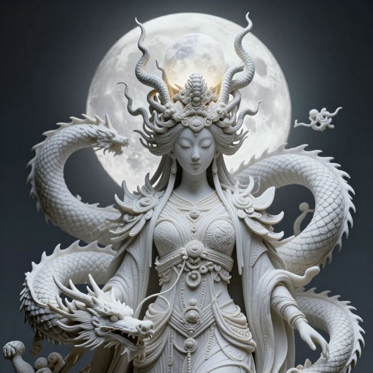Photograph of a detailed, white, sculpted statue of an Asian woman with closed eyes, adorned in intricate traditional clothing and a elaborate headdress featuring curved dragon horns. Two white dragon heads, one in her right hand and one coiled around her left arm, are part of the sculpture. The statue is set against a dark blue background with a full, bright moon in the center, creating a luminous halo effect. The texture of the statue is smooth yet highly detailed, with ornate patterns and jewelry accents. The overall style is mystical and ethereal.