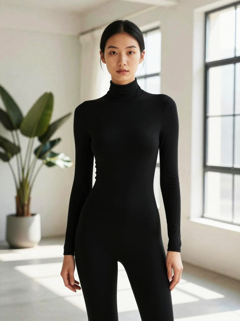 Minimalist fashion portrait of East Asian woman with sleek black hair and soft natural makeup, standing confidently in a bright modern loft, wearing a sleek long-sleeve high-neck jet black bodysuit that accentuates her figure, arms relaxed by her sides, soft window light and clean sunlit room with large plants and neutral decor interior, high-resolution editorial photography
