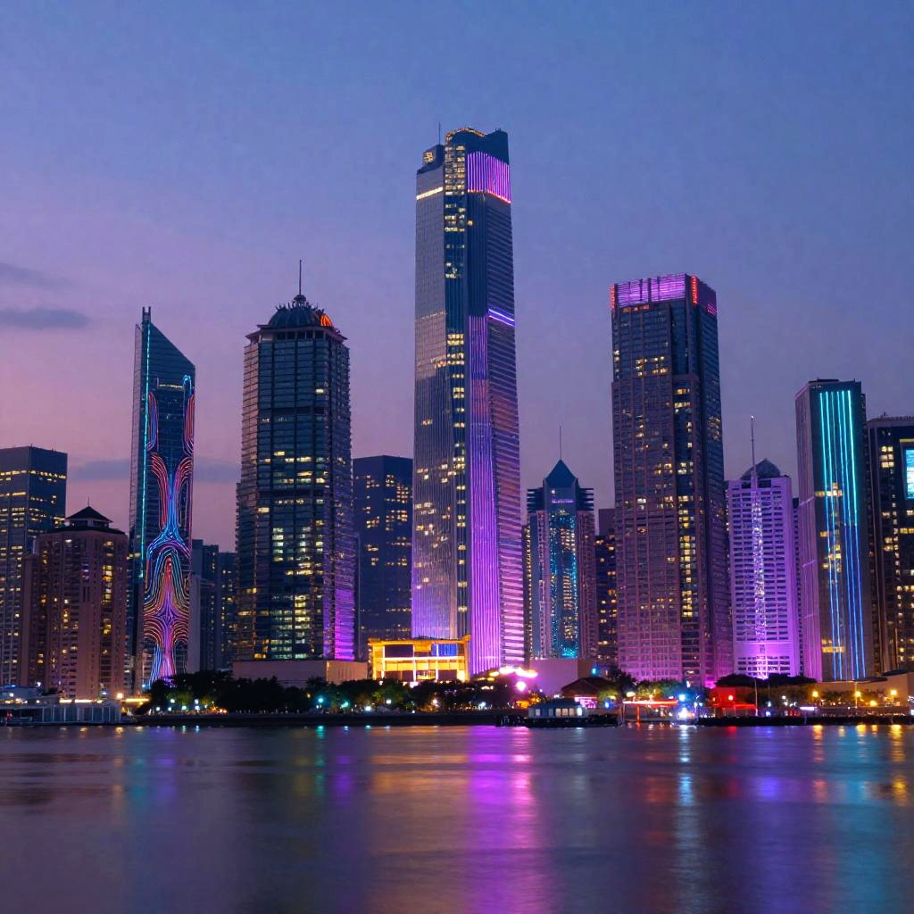 Aesthetic:8lq9fhgo5x8=, surreal digital art of a futuristic cityscape bathed in neon hues, intricate patterns and soft glowing lights, blending cyberpunk and vaporwave styles, ultra-detailed skyline with reflective water surfaces at dusk