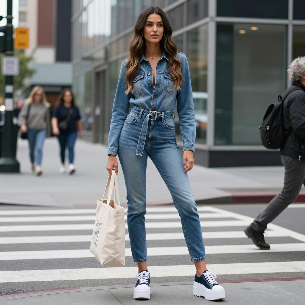 A stylish woman exudes confidence in a chic denim outfit, featuring a tailored corset top and a matching mini skirt. The look is accentuated by a fashionable hat and a soft, urban backdrop, showcasing contemporary fashion trends.