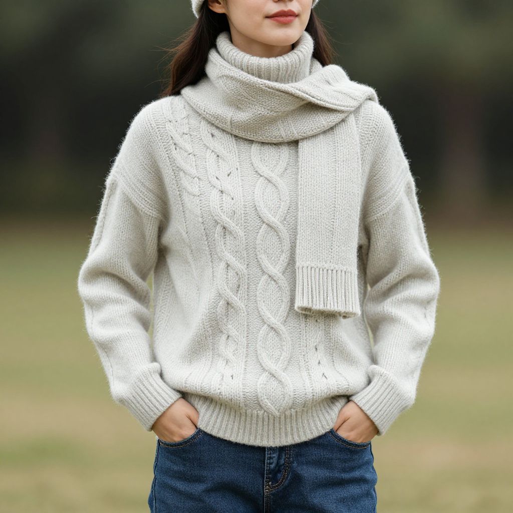 Woman modeling a vintage-inspired Aran sweater, hat, and scarf set, featuring intricate cable knit patterns and a cozy turtleneck design, paired with denim jeans and hands tucked into the sweater's pockets, set against a serene outdoor backdrop with grass and trees.