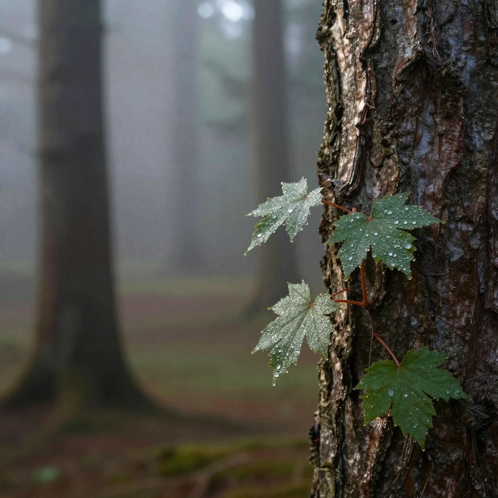 Realistic AI photo generator crafting a serene forest scene in early morning light, with dew-covered leaves, detailed bark textures, and soft mist, combining photo-realistic rendering with AI-driven natural elements and depth of field effects.