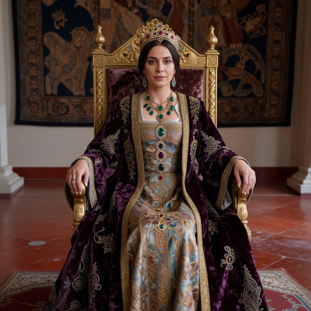 A historically accurate and visually rich scene of a Turkish Ottoman lady in a lavish costume featuring rich velvet, silk, and brocade, with ornate jewels like emerald necklaces and rubies set in gold filigree, sitting on a velvet throne in a palace setting with red-tiled floors and hanging tapestries, facing the viewer with confidence and grace.