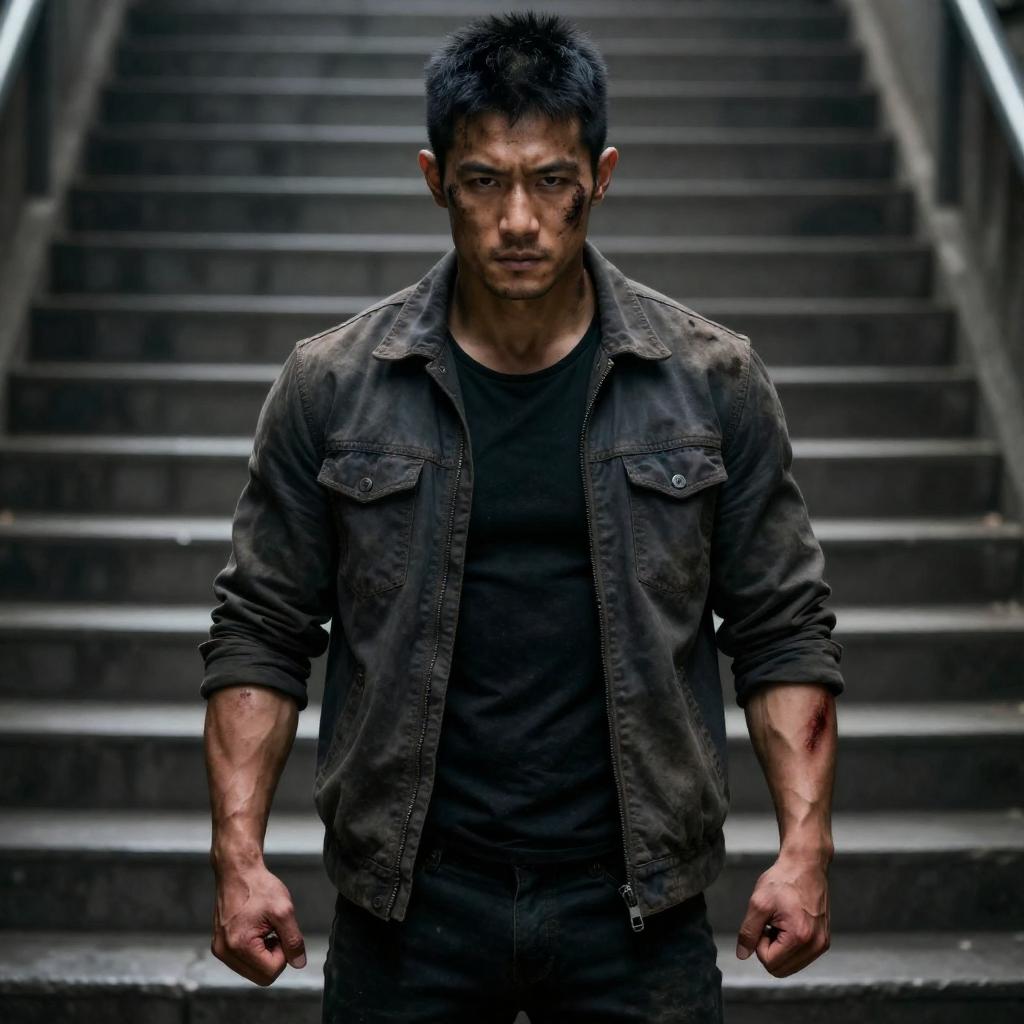 Photograph of a man with spiky dark hair, illuminated by red and blue lighting. He wears rugged, armored shoulder pads and looks slightly to the side with a focused expression. The background is a blurred, bright white light strip. The lighting creates a dramatic, high-contrast effect on his face and armor.
