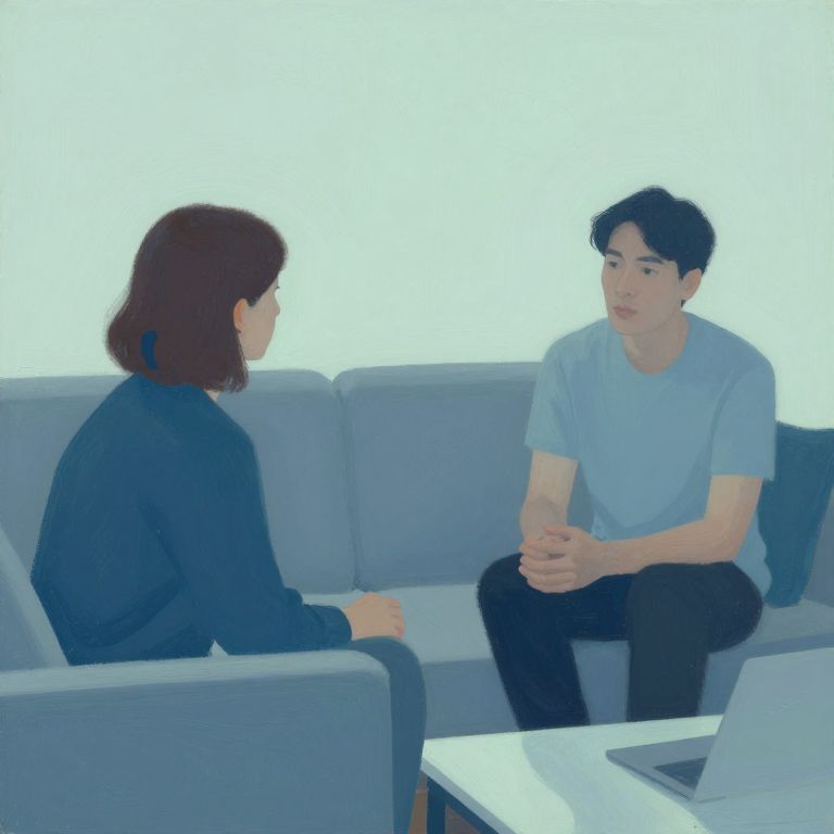 Counseling scene depicted in a minimalist modern setting, with calming blue and green hues, two people engaged in deep conversation on a couch, subtle body language conveying empathy and hope, contemporary artistic style with gentle brush strokes.