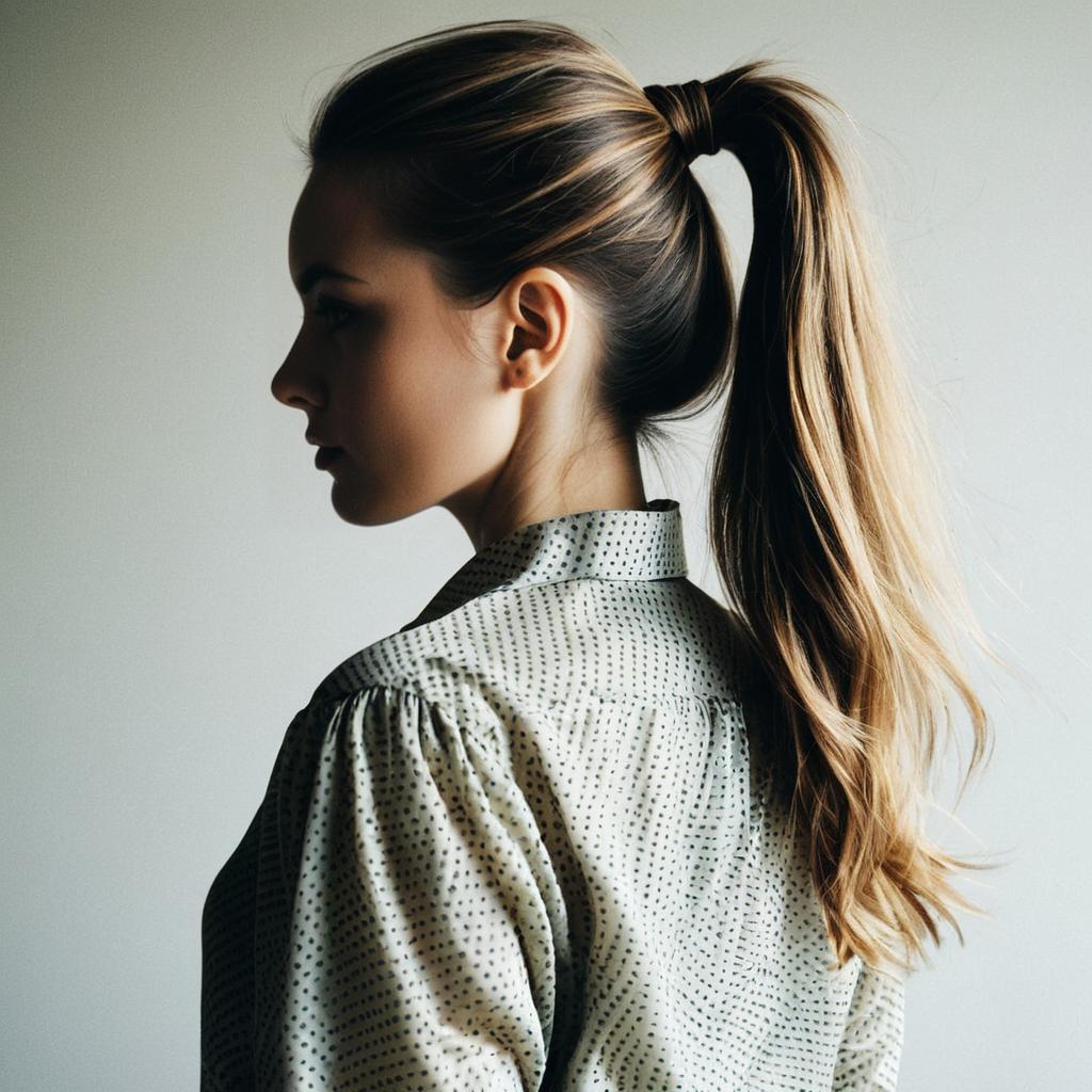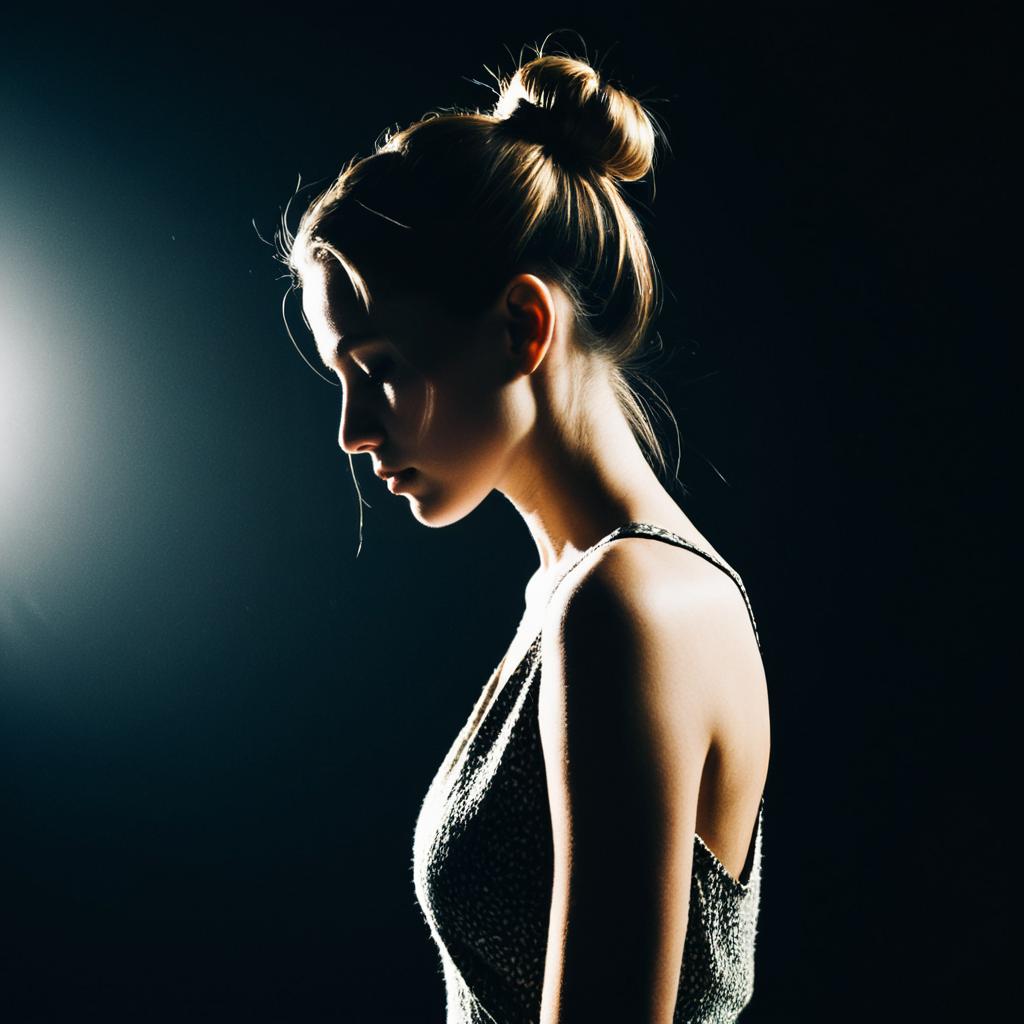 Loose Bun hairstyle on man, wearing bohemian blouse, in rooftop, captured in fashion editorial style with cool ambient light.