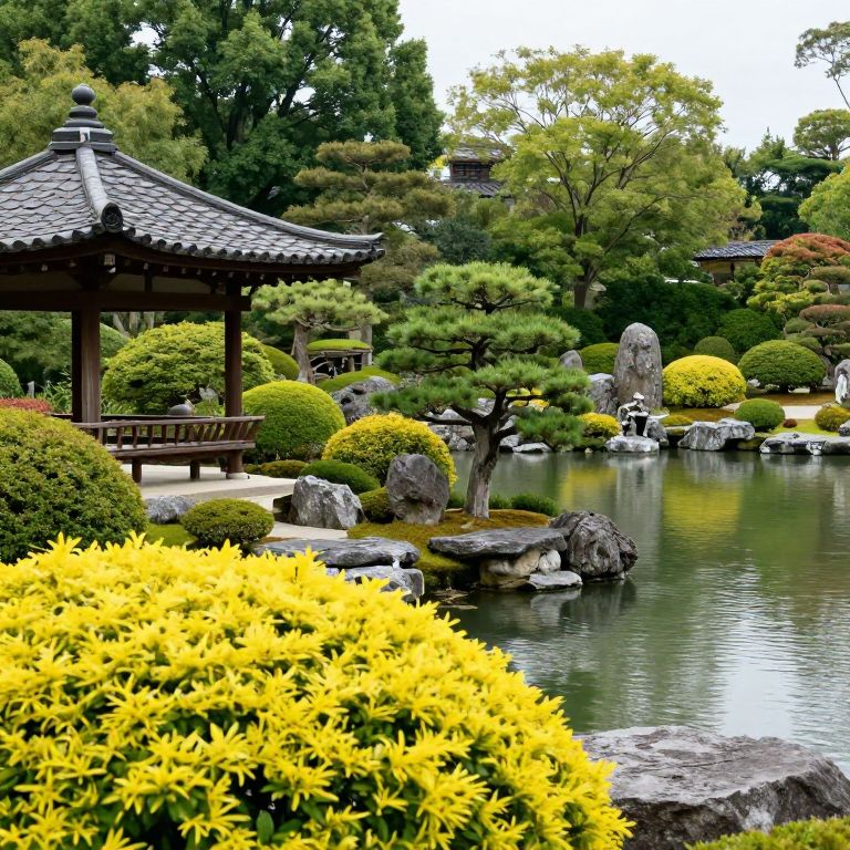 Photograph of a serene Japanese garden featuring a wooden pavilion, small waterfall, large rocks, lush greenery, and vibrant red and green trees.