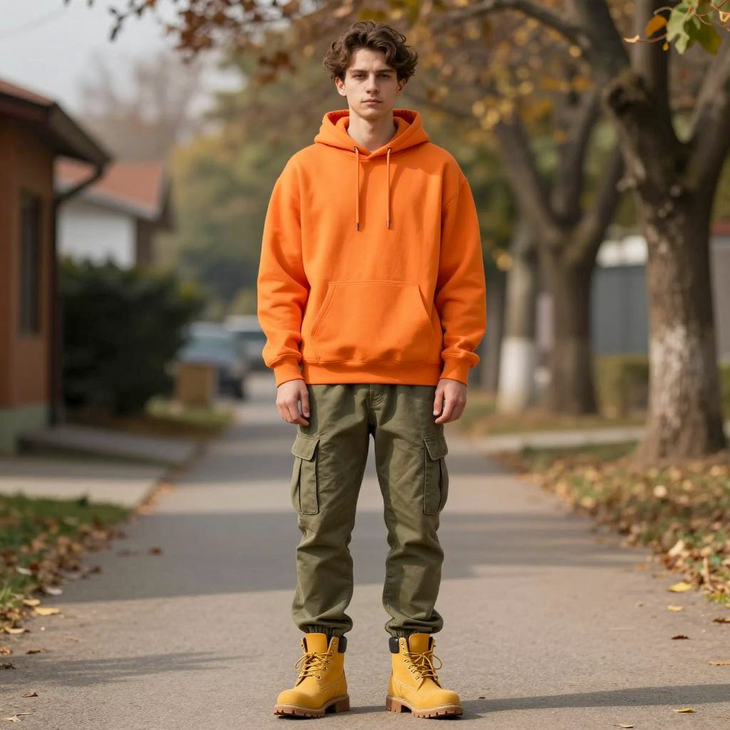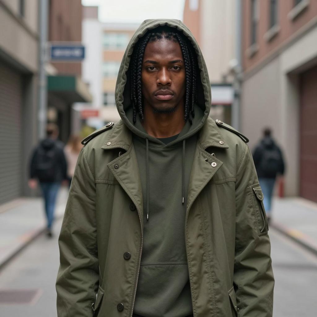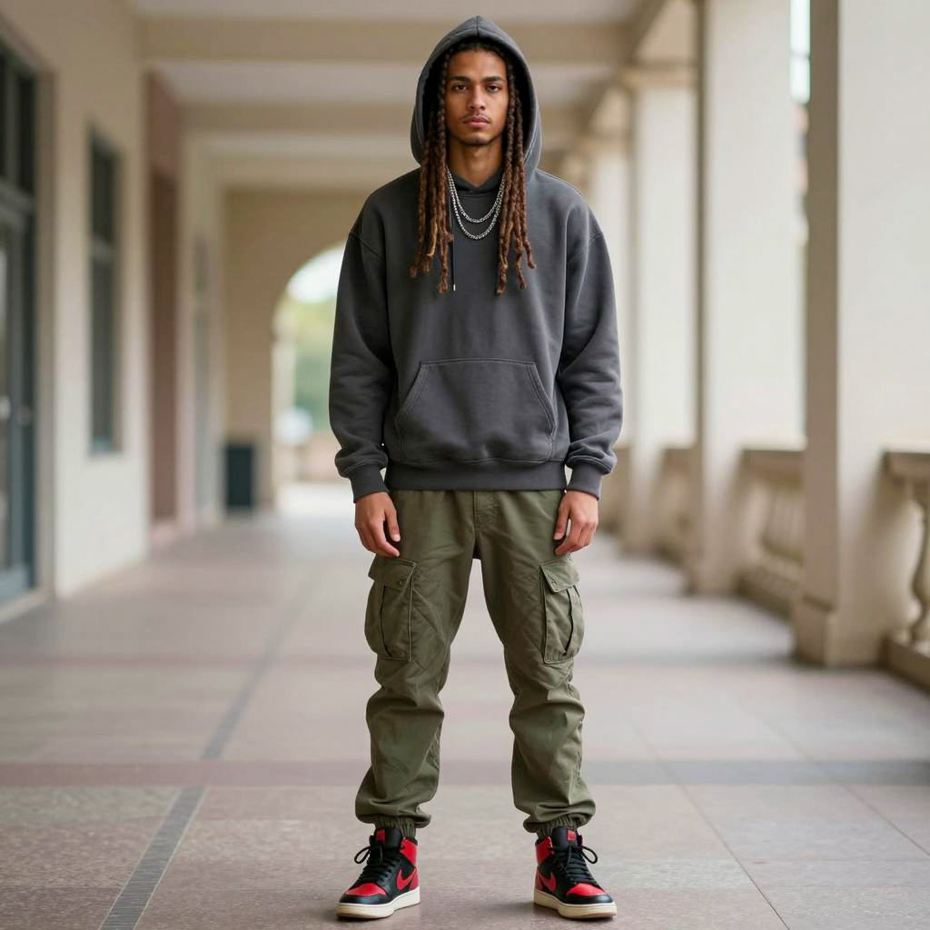 Custom rave clothing costume, photorealistic portrait of a young man, standing in a long corridor, wearing a dark gray hoodie with hood up, olive green cargo pants, black high-top sneakers with red accents, long brown dreadlocks, serious expression, necklace with multiple chains, soft natural light from the corridor, blurry background with columns, subtle shadows, urban style, realistic ures, slight motion blur, standing in the center of the frame, casual fashion, modern streetwear, summer day, mid-length perspective