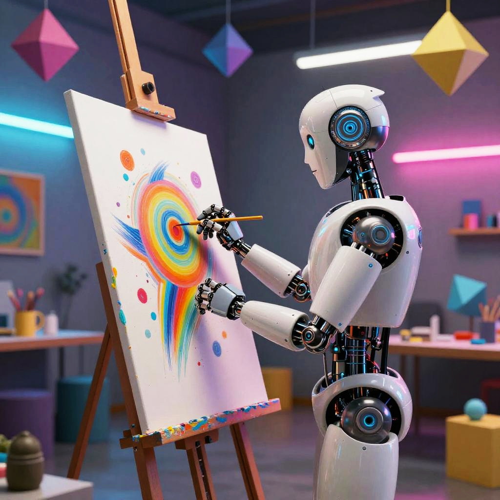 Use AI to draw picture of a robotic artist painting on a canvas in a vibrant studio filled with floating geometric shapes, neon lights, and dynamic brush strokes, capturing the essence of AI-driven innovation meeting traditional art techniques.