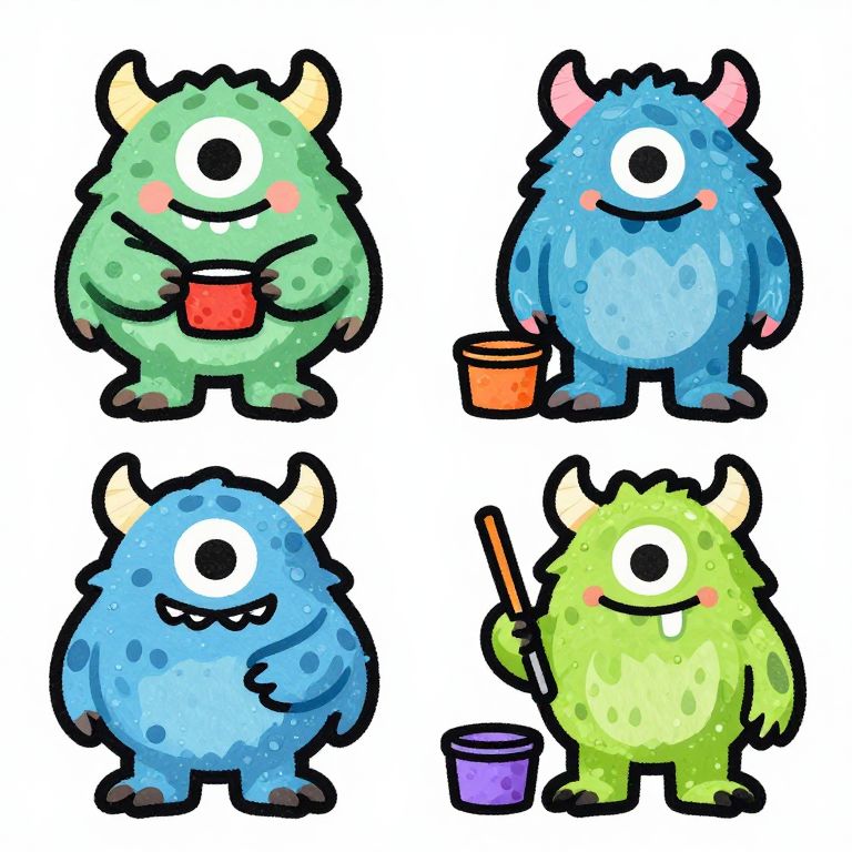 Four colorful, cartoonish, fluffy monsters with horns, holding cups, bucket, and brush; green, blue, green, blue; smiling, cute