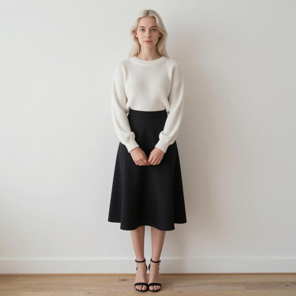 Photograph of a young woman standing against a plain, light-colored wall. She has long, platinum blonde hair and fair skin. She's wearing a white, long-sleeve, chunky knit sweater and a black, high-waisted, A-line skirt. She's also wearing black, open-toe, ankle-strap heels. Her hands are gently clasped in front of her. The floor is light-colored wood, and the overall vibe is simple and minimalistic.