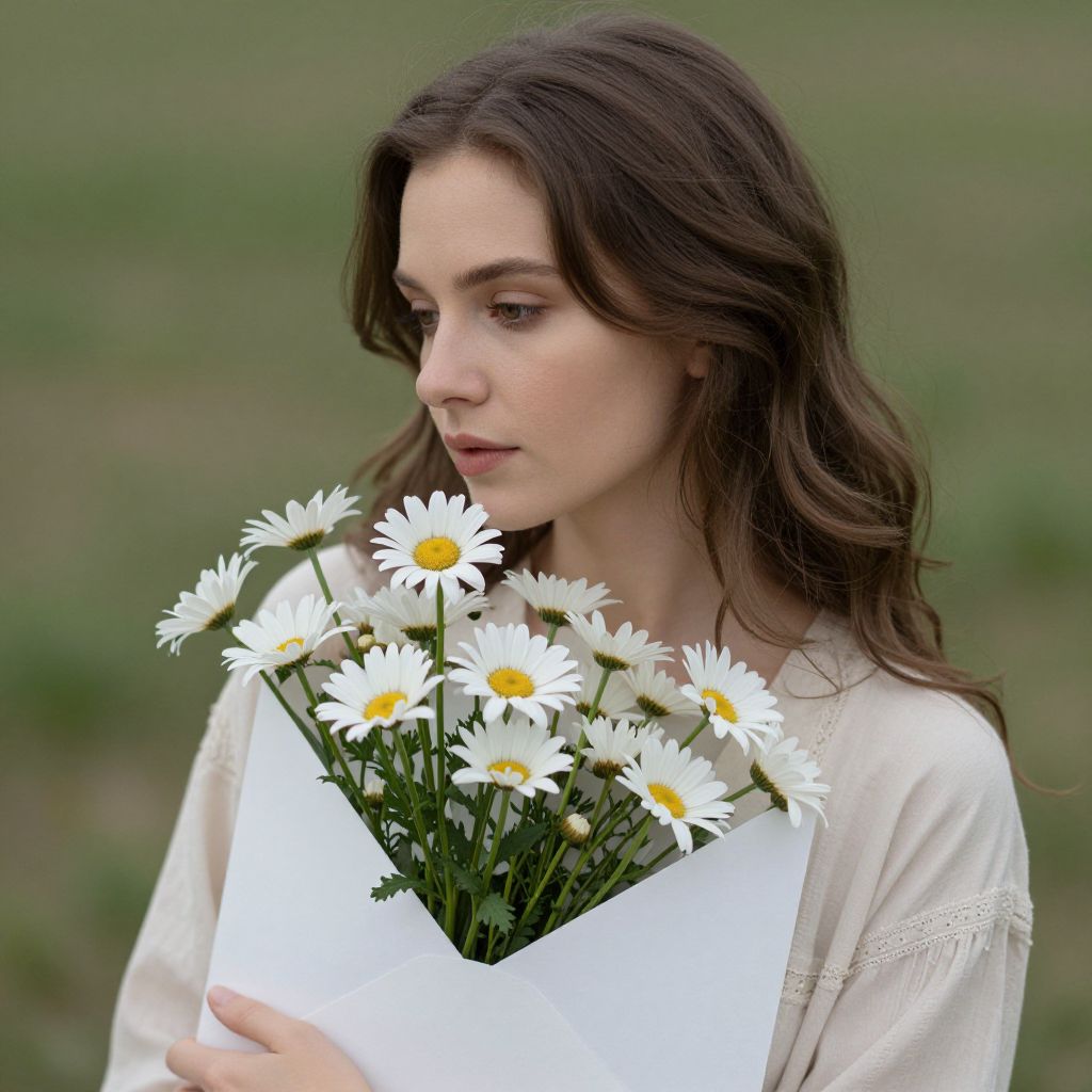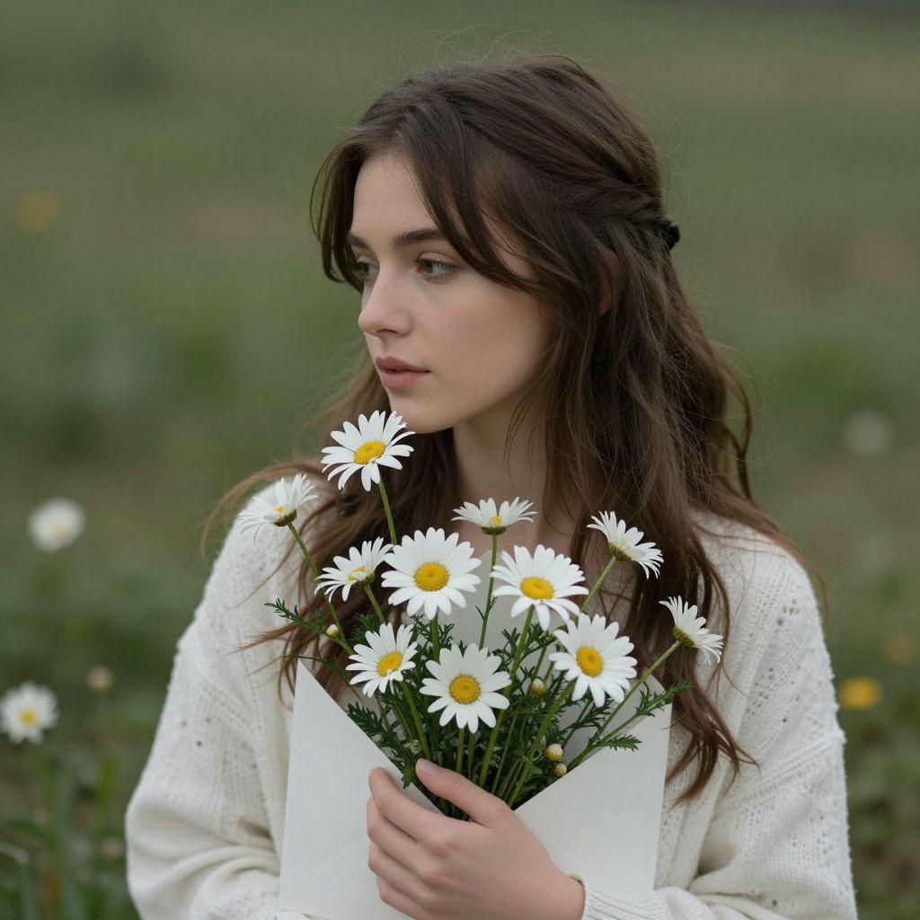Enveloped in the embrace of floral elegance, a woman cradles a daisy, her gaze drifting inward as if lost in the delicate dance between serenity and introspection, where the transient beauty of nature whispers of timeless grace.