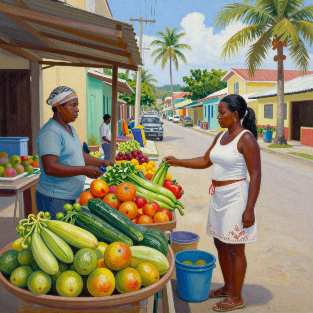 Vibrant photograph of an African-American woman in a floral skirt and white tank top, selling colorful fruits at a street market with a church and cars