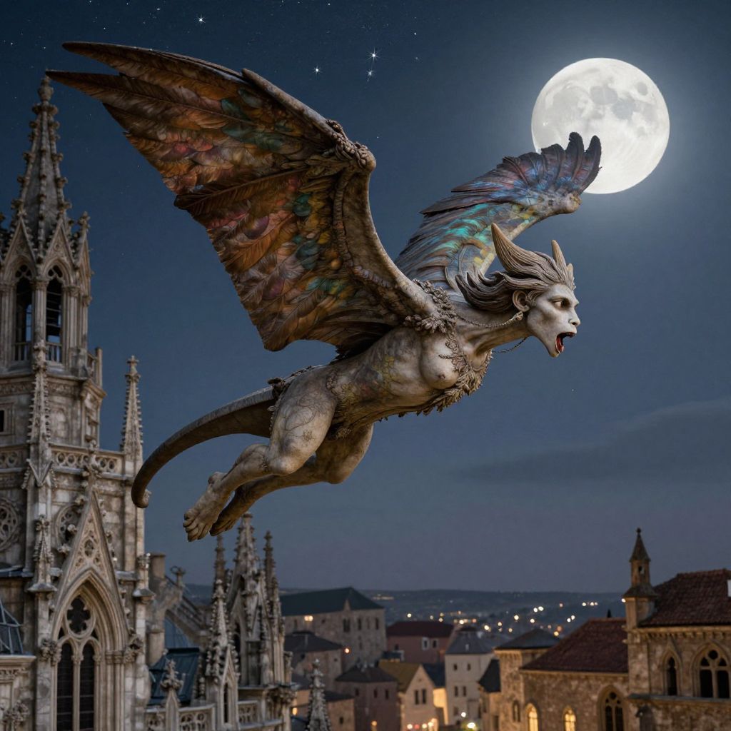 Beautiful female gargoyle flying above a medieval city, ornate gothic architecture below, detailed stone feathers on wings, moonlit sky with scattered stars, dynamic pose with elegance and strength, vibrant colors mixed with dark tones, fantasy concept art.