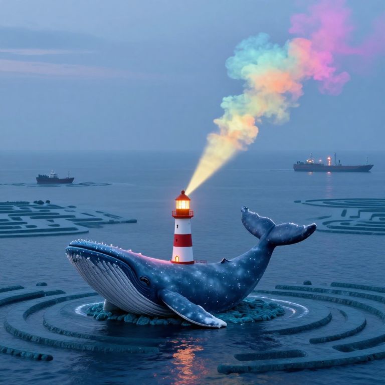 A lighthouse shaped like a whale emits beams of colored smoke, guiding lost ships through mazes of floating landmasses.