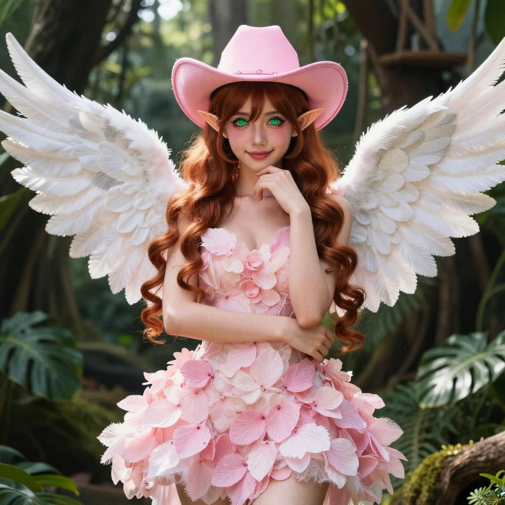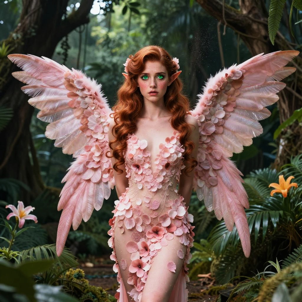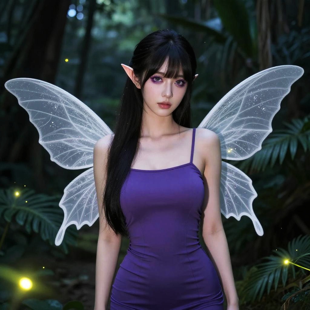 Masterpiece, 8k, perfect ligthing, adult, female, looking at viewer, cinematic lighting, full body shot, Vidia, (VidiaWaifu:1.1), single ponytail, extra long ponytail, dress, tight jumpsuit, (extra long white fairy wings), ((two long wings)), purple clothes, clothes made from leaves, (grey eyes), dark hair, pointy ears, feet, straight armes, shrunken, (lying on the ground), ((inside treetrunk)), blush, pixiedust