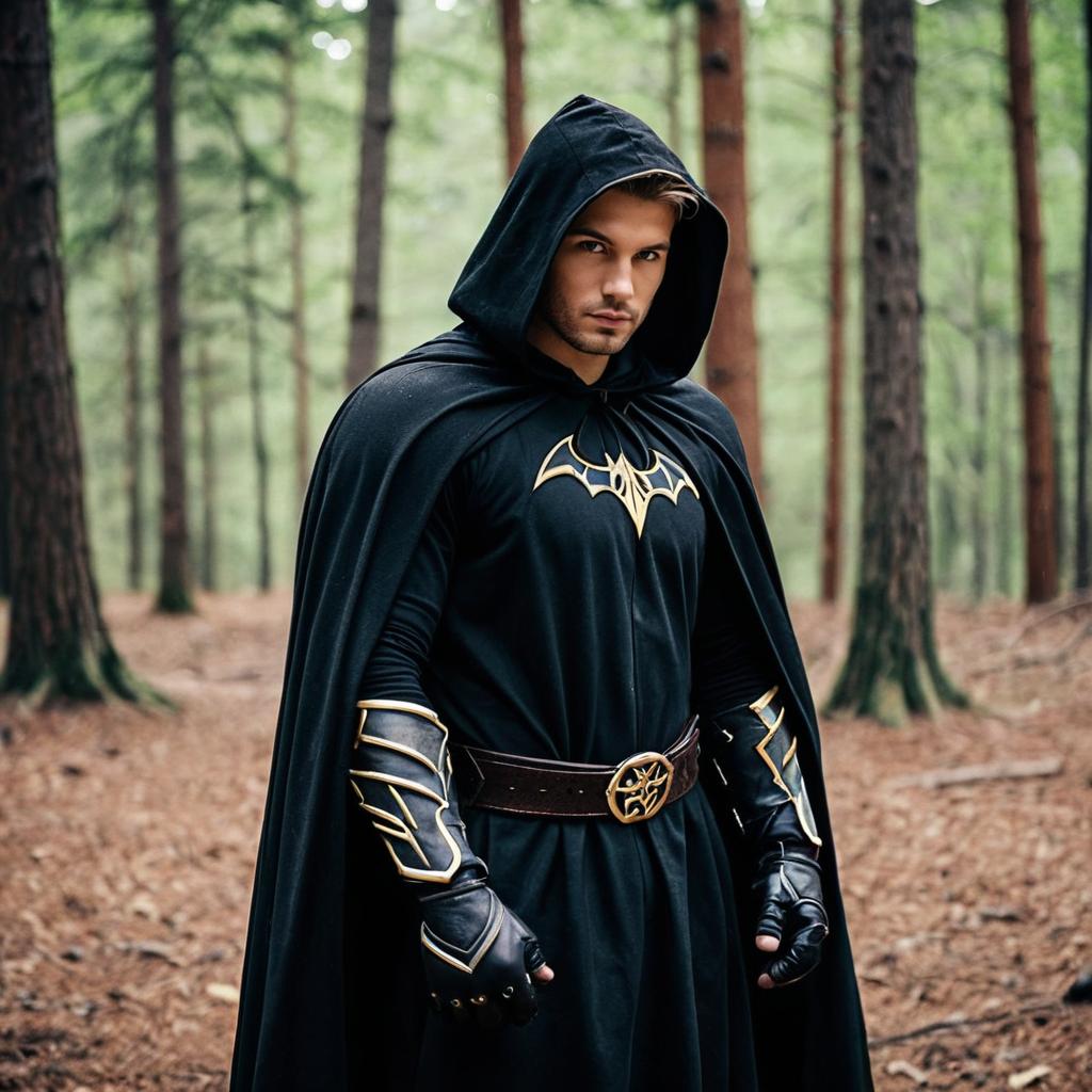 Adult male dressed in a black hooded cape and costume with gold accents standing in a forest. The outfit includes a black cloak with a bat emblem on the chest, leather gloves with gold details, and a belt with an ornate buckle. The man has short blonde to brown hair, a serious expression, and a faint facial tattoo and scar. The background is a blurred woodland scene with tall trees and natural forest floor.