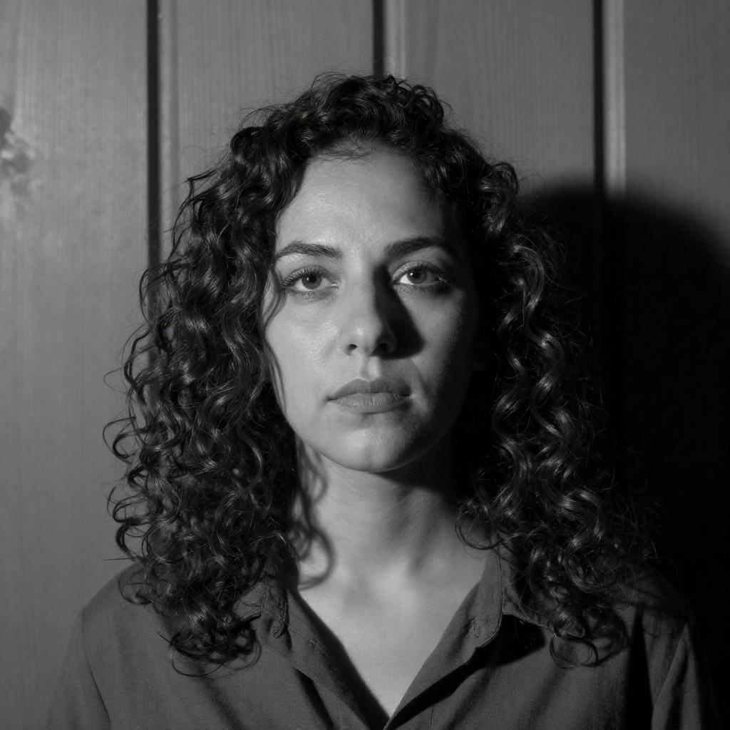Black-and-white photograph of a woman with curly dark hair, wearing a white blouse and light pants, sitting outdoors on a bench. She holds a glass vase with tall grass. Background includes blurred foliage. Her expression is serious, and she gazes directly at the camera. The image has a high-contrast, almost surreal quality.