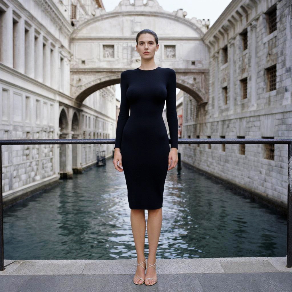 A tall woman in a minimalist, fitted black dress with long sleeves and delicate strappy sandals, captured in the vibrant visual style of Ektachrome film stock, standing in front of the Ponte dei Sospiri with a canal view. Sexy. Pretty face and beаutiful eyes. Big breasts