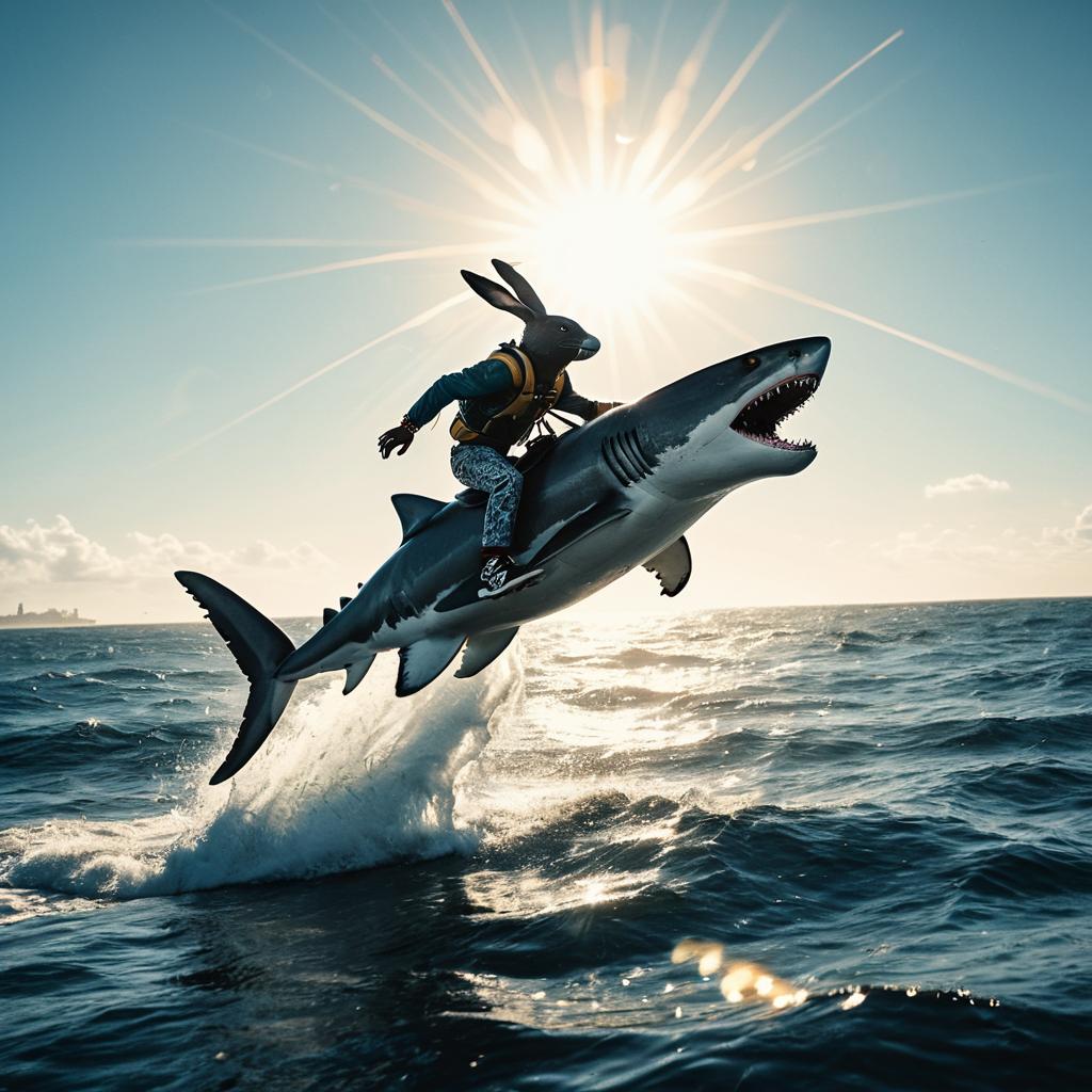 Photorealistic image depicting a cyborg rabbit with a mechanical appearance riding a large flying shark leaping out of the ocean. The shark is posed dynamically like an eagle in flight with water splashing around it. The scene is set under a bright sun with natural cinematic lighting and a sun flare effect, showcasing a detailed ocean horizon and vibrant sky.