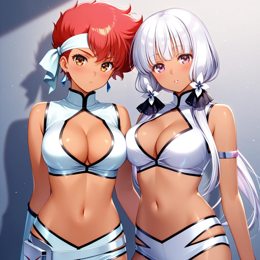 Digital anime-style illustration of two female characters standing side by side. The character on the left has dark skin, short red hair with a white headband, amber eyes, and wears blue earrings. She wears a white and black crop top and matching shorts, revealing cleavage and midriff. The character on the right has fair skin, long white hair styled with black and white floral accessories, pink eyes, and a silver armband. She wears a similar white and black crop top and shorts outfit with cleavage and exposed midriff. Both characters have a confident expression and are drawn with vibrant colors and detailed shading.