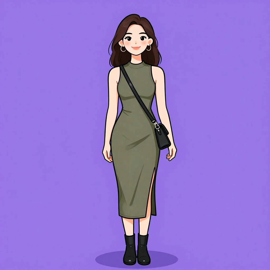 Digital anime-style drawing of a smiling woman with brown hair, wearing a light gray sleeveless dress, black jacket, and black ankle boots, against a