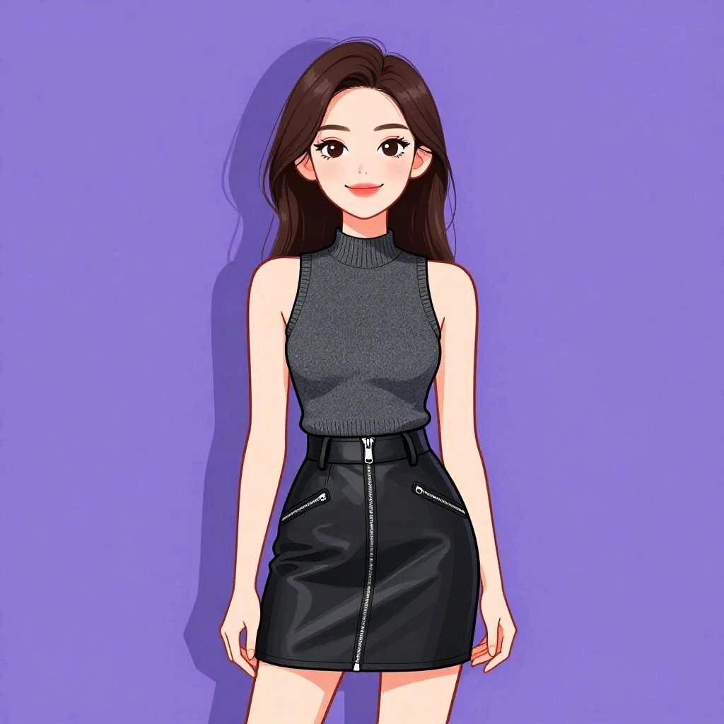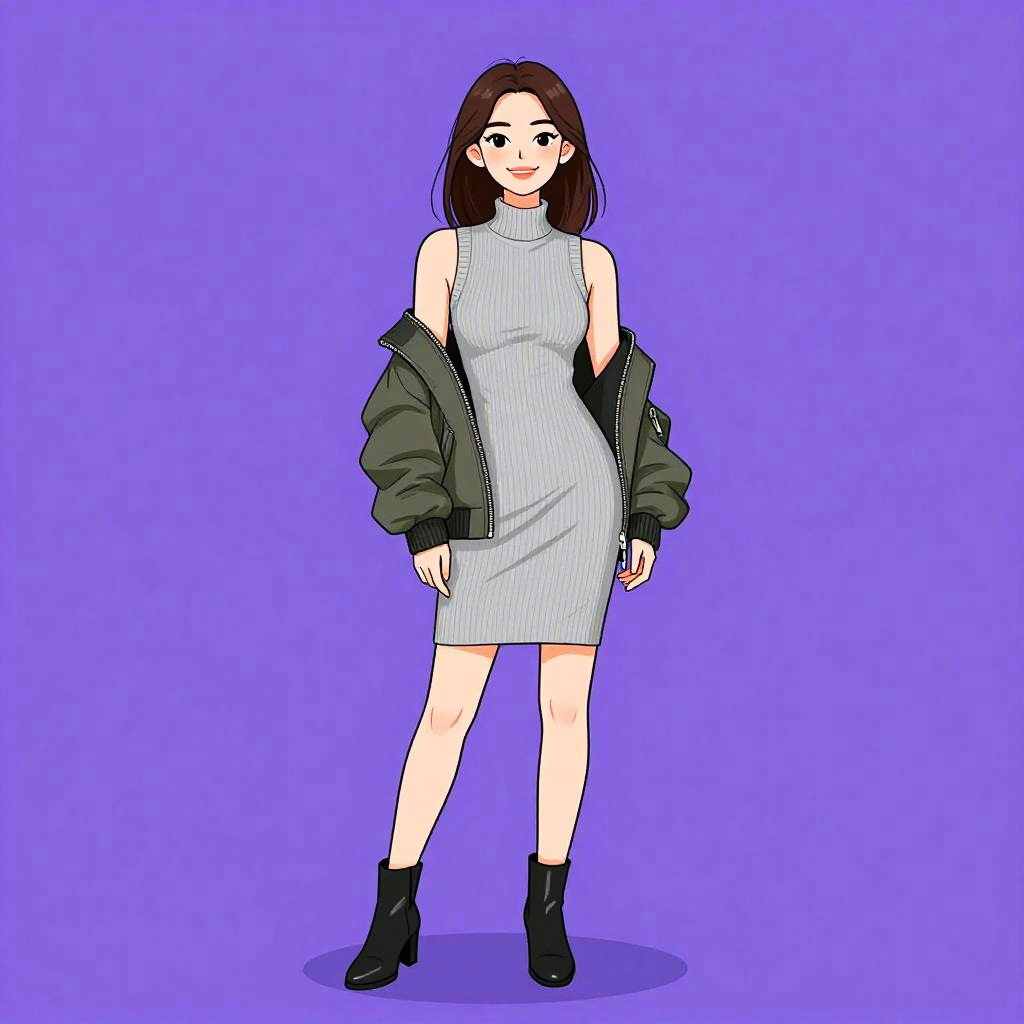 This digital illustration features a young woman with fair skin and straight, dark brown hair standing against a solid purple background. She wears a sleeveless, light blue, ribbed dress that ends mid-thigh, paired with a black, unzipped jacket that hangs off her shoulders. Her outfit is completed with black ankle boots. She has a slight smile and her arms rest casually by her sides. The style is reminiscent of anime or manga, with clean lines and a flat color palette. The background is a simple, solid purple, which contrasts with her light-colored dress, making her the focal point of the image.