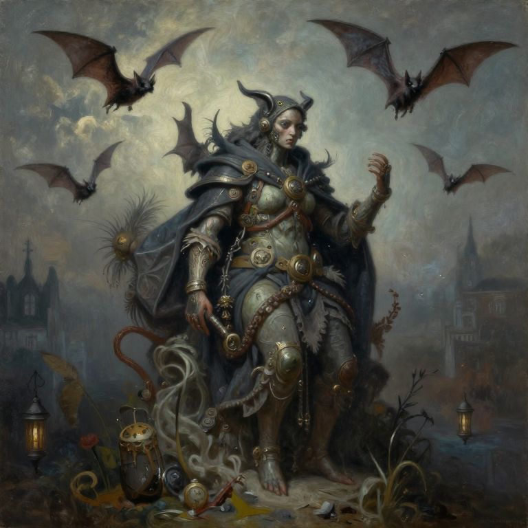 Sculpting by simon bisley decopunk,fantasy art,oil painting,old world, ,mystical,surreal,dystopia,muted colors,bats,
