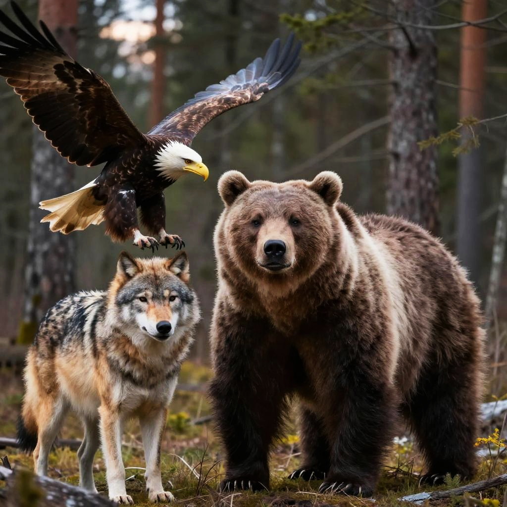 Putin bear as a symbolic guardian of the Russian wilderness, standing alongside wolves and eagles, dynamic pose with wind blowing through dense forest, dusk colors blending warm and cool tones, cinematic composition with detailed fur and natural elements.