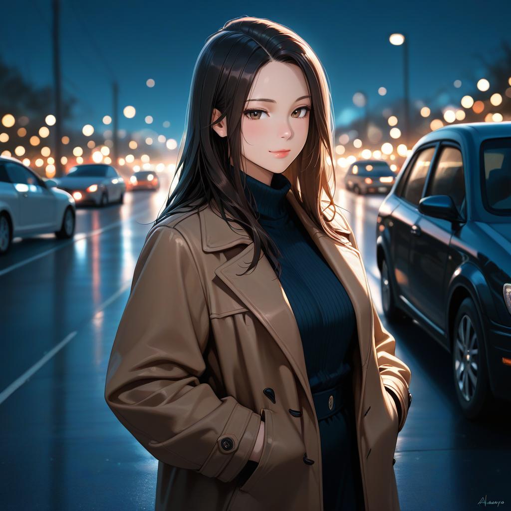 A woman standing on the side of a road at night, 1girl, long hair, motor vehicle, car, looking at viewer, ground vehicle, night, hands in pockets, blurry background, coat, black hair, parted lips, bokeh, jacket, brown hair, outdoors, red lips, upper body, artist name