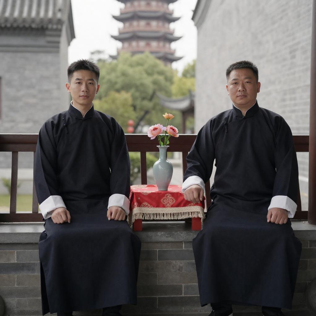 Photograph of six men in traditional Chinese attire standing in a red-walled room with intricate patterns. They surround a wooden table with a multi-tiered stone sculpture. One man in a white suit gestures towards the table. Red chairs and a ceramic jar are in the foreground. The room has a traditional Chinese aesthetic.
