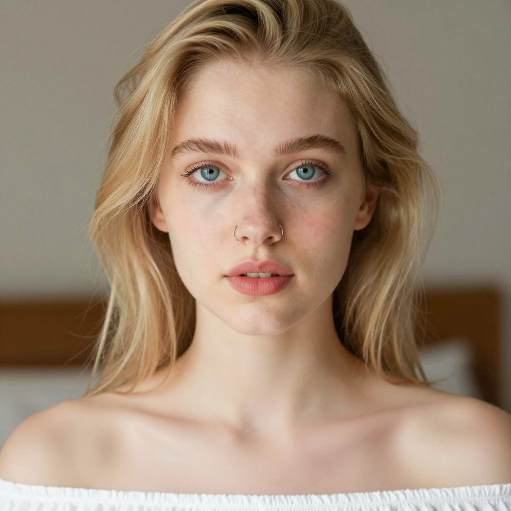 A serene beach scene featuring a young woman with blonde hair, standing gracefully in soft sunlight. She gazes directly at the camera, exuding a sense of calm and confidence, while the gentle waves and sandy shore create a picturesque backdrop.